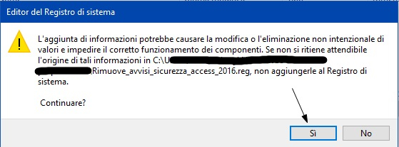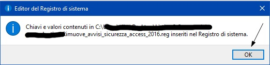 - Scaricare ed eseguire il file Carica_dati_rim_avv_sic_acc_2016.reg. Durante l'installazione apparirà una maschera di avviso dell'editor del registro di sistema, come già visto in figura 9. Agire sul pulsante ``Sì''. Apparirà inoltre una maschera di informazione dell'editor del registro di sistema, come già visto in figura 10. Agire sul pulsante ``OK''.