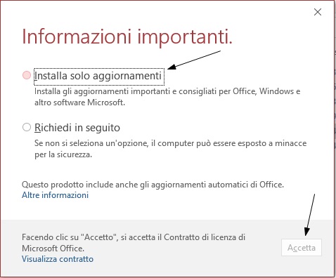 Inoltre, durante il primo avvio di una qualsiasi delle applicazioni apparirà una maschera come in figura 15. Selezionare ``Installa solo aggiornamenti'' e poi agire sul pulsante ``Accetta''. Questa operazione invece dovrà essere eseguita una solo volta da chi non possiede Microsoft Access 2016 ed utilizza il runtime.