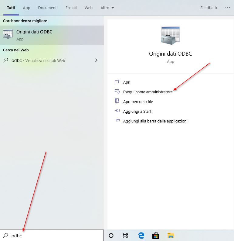 - Sulla barra di ricerca di Windows digitare: ODBC.