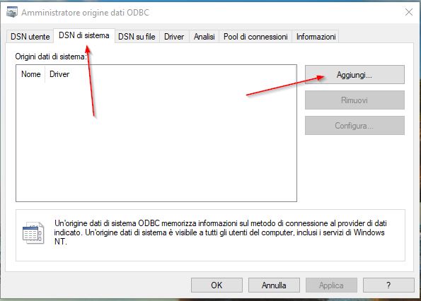 - Selezionare la linguetta ``DSN di sistema'' e poi ``Aggiungi''. Si veda Figura 6.
