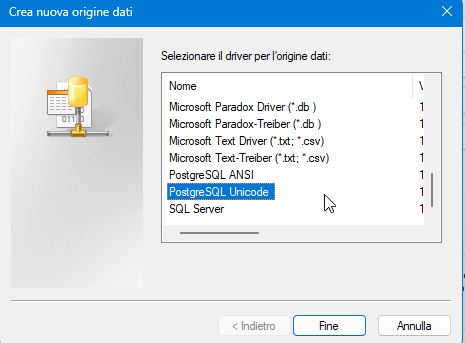- Selezionare ``PostgreSQL Unicode. Si veda Figura 7.
