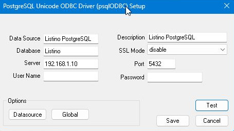 - Apparirà una maschera vuota, avente titolo ``PostgreSQL Unicode ODBC Driver (psqlODBC Setup)''. Completarla come in figura 8 e salvare.