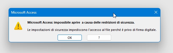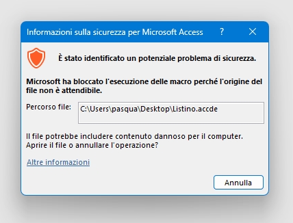 L'installazione delle varie applicazioni è terminata, ma per questioni di sicurezza Microsoft Access blocca l'esecuzione delle macro rendendo di fatto inavviabile ogni applicazione scaricata da Internet. In effetti provando ad avviare una qualsiasi delle applicazioni appena installate si otterranno messaggi di avvertimento. Si vedano Fig. 11 e Fig. 12. Ciò costringe a chiudere l'applicazione.