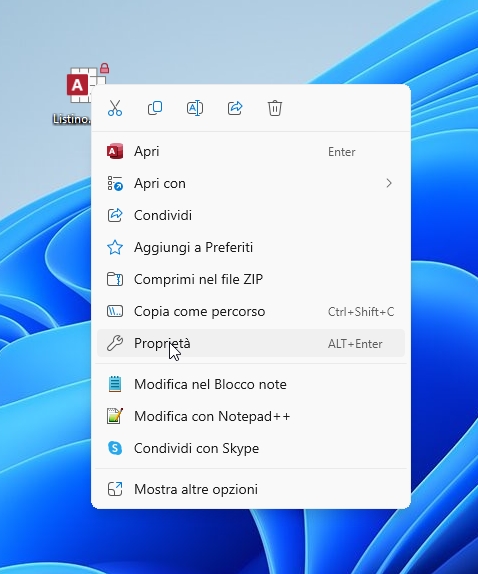 Per risolvere questo impedimento dettato da ragioni di sicurezza è necessario eseguire tasto destro mouse sull'icona dell'applicazione inavviabile e quindi selezionare ``Proprietà''. Si veda Fig. 13.